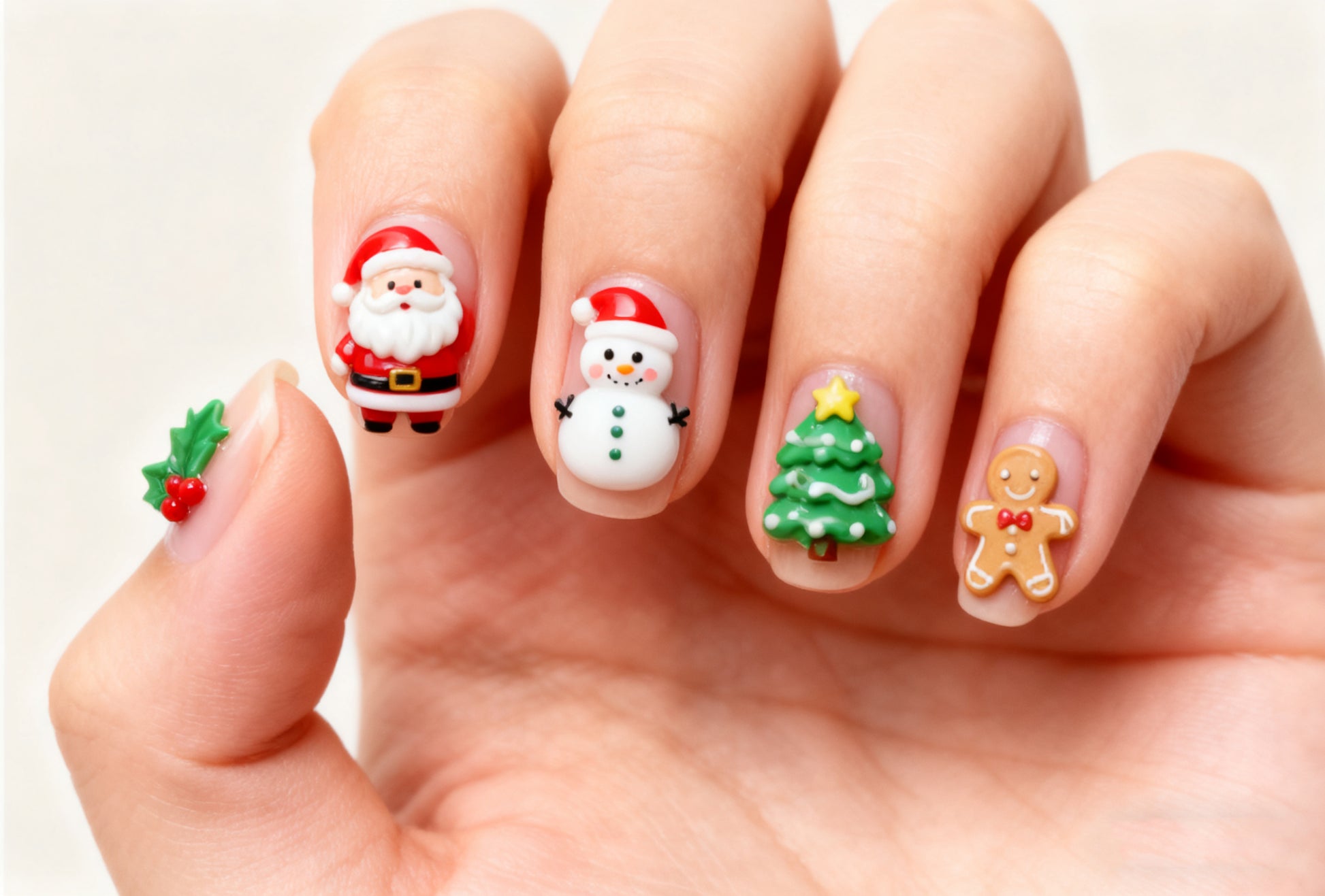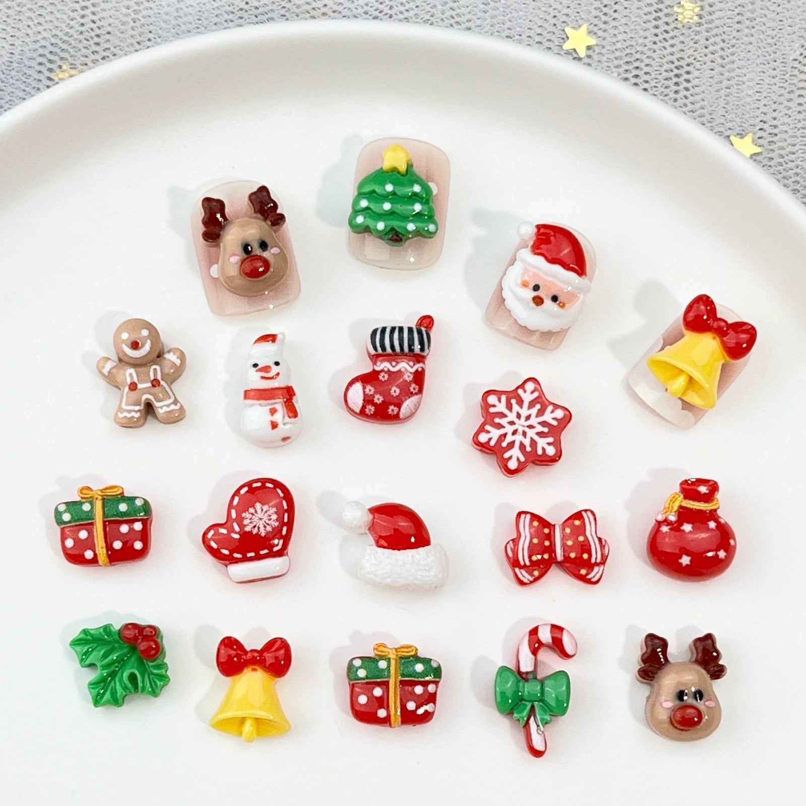 This cross-border Christmas series of cartoon-themed nail art accessories features 15 classic holiday elements, including Santa Claus, Christmas trees, snowmen, gingerbread men, stockings, and reindeer.
