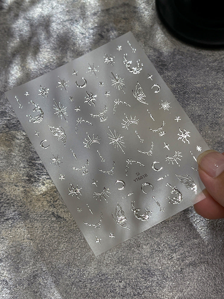 Each sheet is packed with intricate celestial designs (moons, shooting stars, sparkles) in a rich metallic gold finish, perfect for mixing & matching to create Y2K grunge, retro fairy, or minimalist chic nail art.